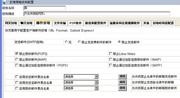 對(duì)于客戶(hù)端郵件,可以選擇"郵件封堵"標(biāo)簽,具體可以配置禁止收發(fā)以及黑白名單過(guò)濾(參考網(wǎng)站黑白名單配置用例)等.如圖: