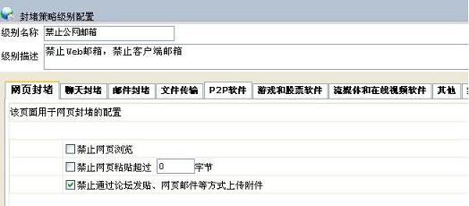 首先,我們需要先新增一個(gè)封堵策略級(jí)別.選擇"監(jiān)控配置"->"封堵策略級(jí)別配置",點(diǎn)擊"新增級(jí)別"可以打開(kāi)封堵級(jí)別配置頁(yè)面.輸入名稱(chēng),描述,對(duì)于web郵件只需在"禁止通過(guò)論壇發(fā)貼、網(wǎng)頁(yè)郵件等方式上傳附件"前打勾即可.如圖: